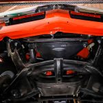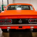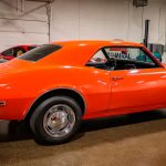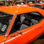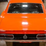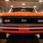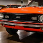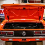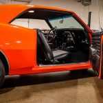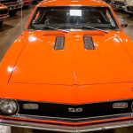 The exterior of this Camaro SS is finished in the iconic Hugger Orange, a color that epitomizes the boldness and confidence of the era. This vibrant hue not only enhances the car’s visual appeal but also symbolizes the high-performance capabilities that lie within. The exterior’s overall design showcases the car’s aggressive stance with its wide front grille, dual headlights, and sculpted body lines that define its timeless appeal.